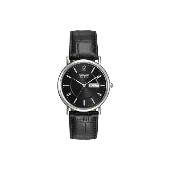 Primary Material : Stainless Steel | Case depth approx : 8.00mm | Case width approx : 36.00mm | Case shape : Circle | Strap type : Leather strap | Strap colour : Black | Clasp type : Strap buckle | Dial colour : Black | Glass : Mineral | Movement : Eco-drive | Movement Source : Japan | Water Resistance : Water resistant | Includes date function | Guarantee : 5 years